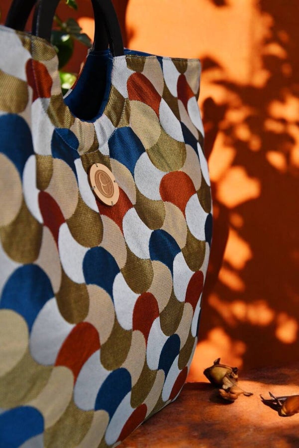 Poignées : Doté de poignées en bois, le sac cabas peut être porté à la main.