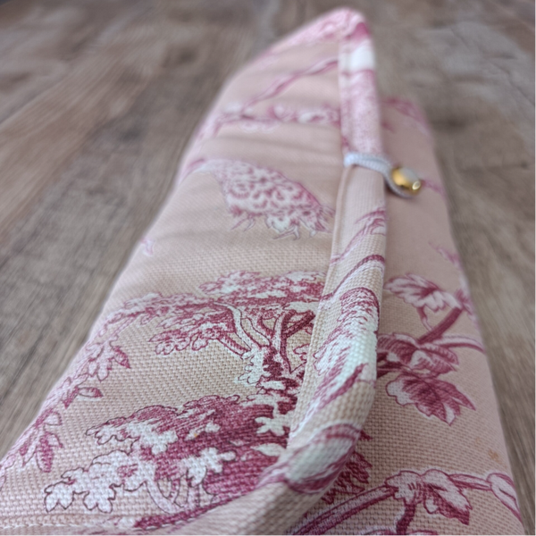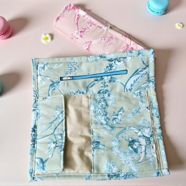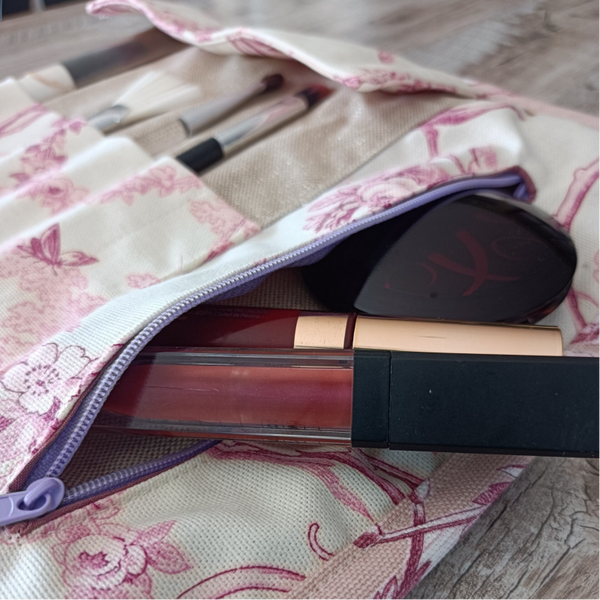 Fabriquée en toile de jouy, molleton et toile enduite, cette trousse à maquillage est facile à nettoyer et dure dans le temps.