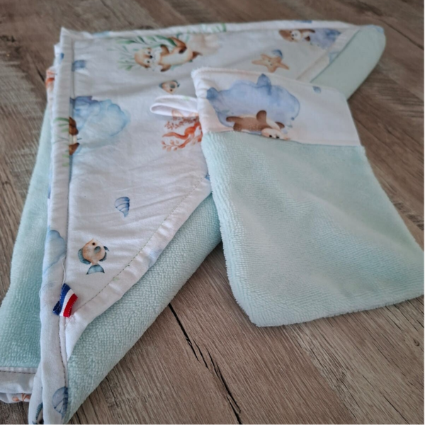 Offrez à votre bébé un véritable cocon de douceur après le bain avec cet ensemble cape de bain et gant de toilette assorti.
